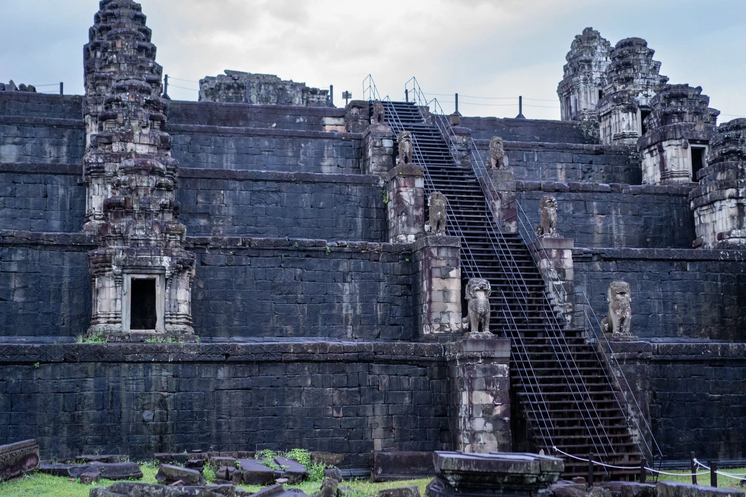 The view wasn't that great on a cloudy, foggy day and the light available was not enough to shoot good quality pics without using a tripod...a tool I had at my disposal of course. After walking in circles with my full frame camera and my little action cam on a long selfie-stick I climbed down the temple and photographed a bit more on the mountain plateau. It is beyond me how they (the ancient Khmer people) came up with the idea to errect a temple consisting of tons and tons of ultra heavy blocks of stone that high up. They couldn’t have made it much harder if they tried to. There are only narrow, unpaved, serpentine-like trails up the mountain. Even if they used poor elephants for the labour– how did they make it up there, let alone dragging a sh*t load of rocks with them?